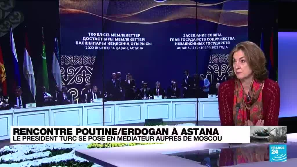Le président russe Vladimir Poutine et son homologue turc Recep Tayyip Erdogan ont entamé jeudi 13 octobre des discussions à Astana, capitale du Kazakhstan. La Turquie a offert dans le passé sa médiation pour ouvrir des pourparlers entre l'Ukraine et la Russie. Une médiation turque peut-elle fonctionner? Sur quoi peut-elle déboucher ? L'analyse d'Armelle Charrier, chroniqueuse international pour France 24.