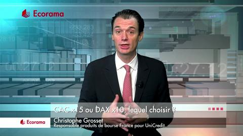 En 90 secondes, Christophe Grosset, responsable produits de bourse France chez UniCredit explique comment faire son choix entre le CAC x15 et le DAX x10. Ecorama du 17 décembre 2015, sur Boursorama.com.