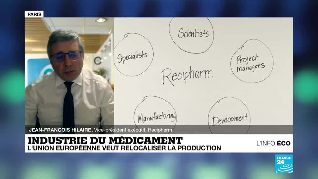 Jean-François Hilaire, vice-président exécutif du groupe pharmaceutique suédois Recipharm, était l'invité de l'Info éco sur France 24. Le laboratoire va produire une partie des doses du vaccin Moderna sur son site français de Monts, près de Tours, dans l'Indre et Loire, a-t-il annoncé sur notre antenne.