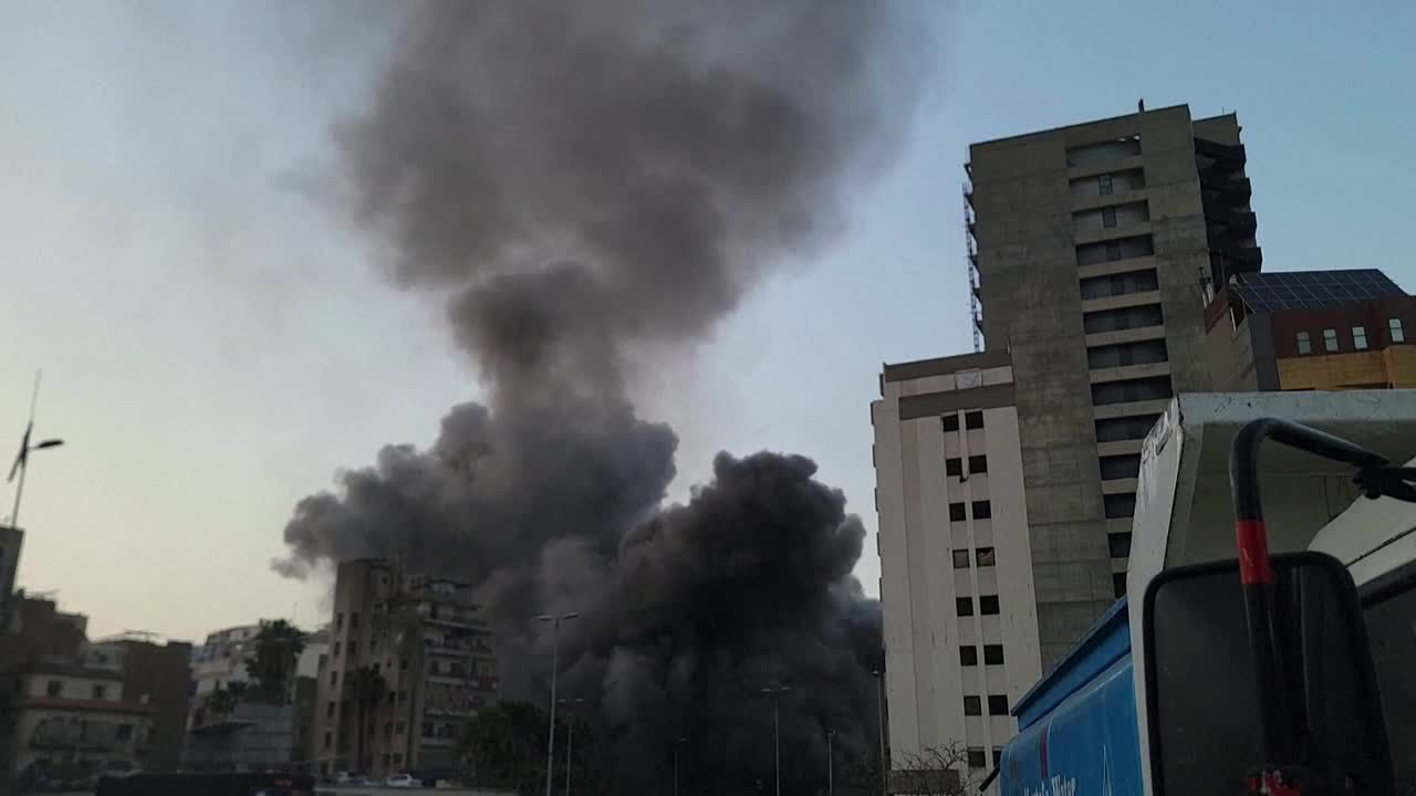 Des images d'AFPTV montrent les moments où deux frappes israéliennes distinctes touchent un immeuble du quartier de Bashoura à Beyrouth, près du centre-ville, après que l'armée israélienne ait lancé un avertissement d'une frappe imminente. Israël a renouvelé ses frappes sur Beyrouth, menaçant de s'emparer de territoires au Liban si le Hezbollah ne cessait pas ses attaques. IMAGES