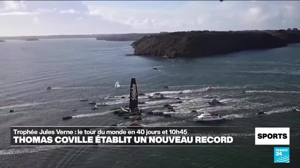 Thomas Coville (Sodebo) et ses six membres d'équipage ont bouclé dimanche au large de Brest le tour du monde sans escale en un temps record de 40 jours 10 heures 45 minutes, soit 12 heures et 44 minutes de mieux que le précédent record du Trophée Jules Verne. Créé en 1993 par Titouan Lamazou et Florence Arthaud, le trophée Jules Verne consiste à faire le tour du monde à la voile en moins de 80 jours, sans assistance externe.